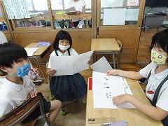 ↑4年 国語 お礼の気持ちを伝える学習に入りました。手紙の書き方についての学習です。まず先生がこれからの学習のモデルとなるゴールの姿を作って、みんなに見てもらいました。ゴールのイメージを持つことができました。そのあと、「では、これからどういう学習をすればいいかな」と問いかけると、子供たちは、ゴールに至るまでの学習を考え発表し、最後に、どの学習をしたいか決めました。子供たちが主体的に、ゴールへ向かう学びを決定し、自ら学習を進めています。