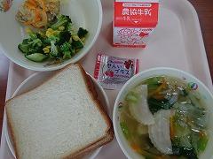↓今日の給食は、ミルク食パン、いちごジャム、魚のマリネ、コーンサラダ、ラピオリスープです。