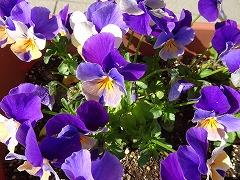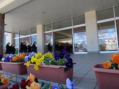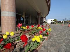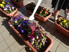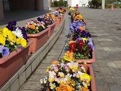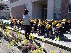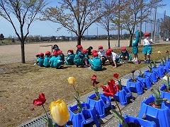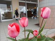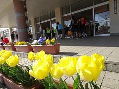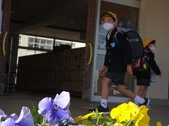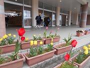 ↓チューリップやパンジーが春の光を浴びてうれしそうに子供たちを迎えています。