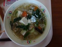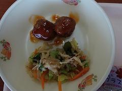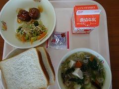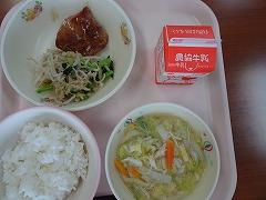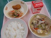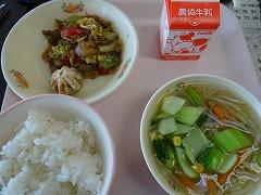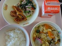 ↓今日の給食は、ごはん、多彩パオズ、ホイコーロー、みそワンタンスープの中華料理でした。いろどりがとてもよく食欲も見ただけで一層わいてきました。味も抜群でとてもおいしかったです。