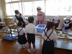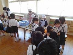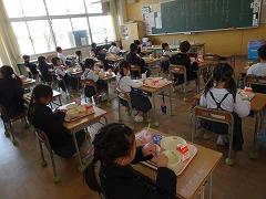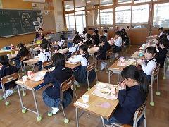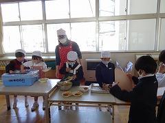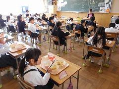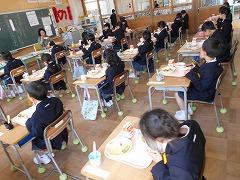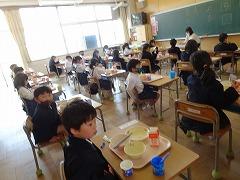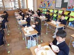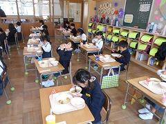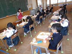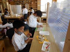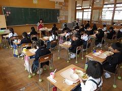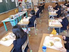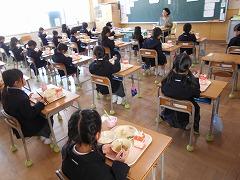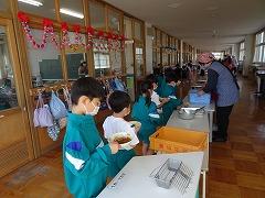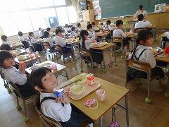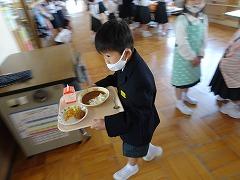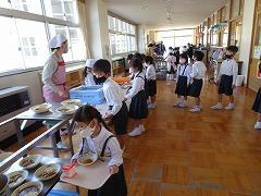 ↓1年生は給食の配膳も随分慣れてきたようです。そして、みんなとてもおいしくいただきました。ごちそうさまでした。