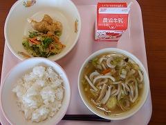 ↓今日の給食は、あんかけうどん、菜の花胡麻和え、鶏肉のレモン風味、ごはんです。あんかけうどんには生姜が入っていて、あたたまりました。菜の花胡麻和えでは、春の季節をいただきました。鶏肉はレモン風味で、さっぱり、これまた、春という感じで給食で季節を味わっています。