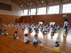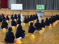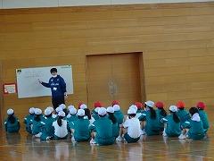 ↑まずは、体育館でおまわりさんと安全に歩くための3つの約束をしました。「止まる」「見る」「待つ」です。ビデオを見て確認しました。