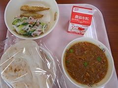 ↓今日の給食は、ナン、キーマカレ―、わかさぎのフリッター、大根サラダでした。キーマカレーはトマトがたっぷりで、酸味とコクがあるおいしいカレーでした。