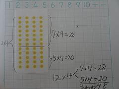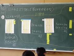 ↓3の1 〈12×4はどうすれば答えが分かるかな〉九九を使って2つに分けて考える方法で答えを求めました。授業後半の活用問題も全員出来ました!