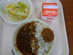 ↓今日の給食は、ハヤシライス 牛肉とマッシュルーム入りで本格派の味です。かぼちゃこコロッケはチーズ入りで外はカリッ、中はとろーり、とてもおいしかったです。キャベツのマリネは春の季節感たっぷりでした。