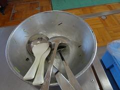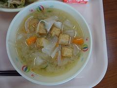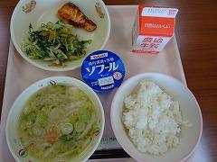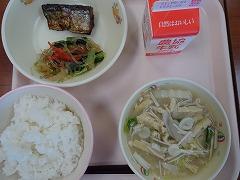↓今日の給食は、ごはん、鮭の白糀焼き、水菜のはりはり和え、打ち豆汁、ヨーグルトでした。豆を打って、具としてみそ汁に入っていました。懐かしい温かい味でした。5年生はランチルームで食べています。1年生の食管も空っぽでした。感謝していただいています。