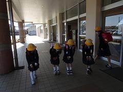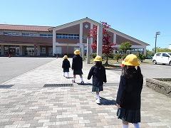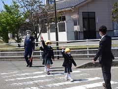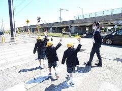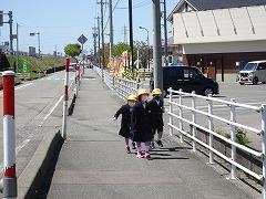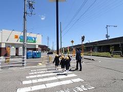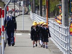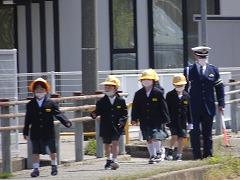 いよいよ、外に出て体験学習です。4,5人のグループになり、子供たちだけで歩きます。途中におまわりさんや先生方が立って、安全な歩き方ができているか確認しました。