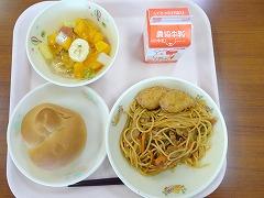↓今日の給食は、米粉ミルクロール、チキンナゲット、スパゲティナポリタン、フルーツゼリーでした。米粉ロールはふわふわで、スパゲティーナポリタンはトマトたっぷりにマッシュルームやにんにくも加わって、どうしてこのような美味しい味が出るのかと思うほどおいしいスパゲティでした。ゼリーは涼しさいっぱいで初夏先取りのひんやりデザートでした。