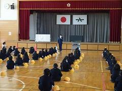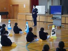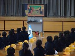 今日は1年生の交通安全教室を開催しました。津幡警察署から2名の警察官をお招きし、安全な歩き方を教えていただきました。