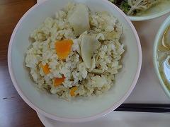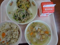 ↓今日の給食です。たけのこご飯、石川産の地物のタケノコです。皮をむいたりした処理をするのが大変だったそうですが、やはり、旬のものは味が違いました。野菜のかき揚げは、カリット揚がり、玉ねぎ、にんじん、トウモロコシ、小松菜、ごぼうなど、たくさんの野菜が入っていて、とっても豊かな味でした。ツナとわかめのレモン和えは、ツナのにおいをとるために、レモンを入れてさっぱりと仕上げるそうです。たくさん食べることができるおいしい和えものでした。ごちそうさまでした。