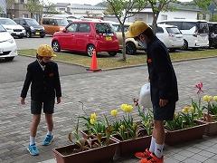 4月27日(火)昨日より気温が上がりました。朝の玄関では、元気なあいさつ・礼儀正しいあいさつに加えて、水やりの仕事や花の観察をする子供たち等、ほほえましい姿をたくさん見ることができます。