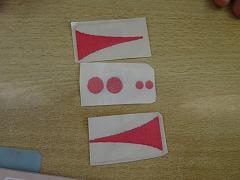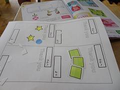 ↓5の1図画工作 こすりだすと虹色が浮かび上がる不思議な台紙です。こすった形から何が生まれるかな、創造力を働かせて作品を作っていきます。