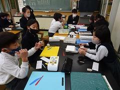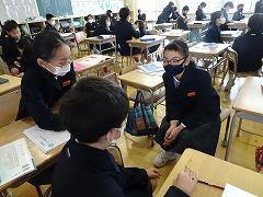 ↓5の2家庭科 家族のよさを見つけるために家族団らんのよさを話し合っています。