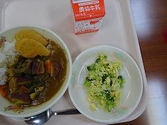 ↓今日の給食は、冬野菜カレーです。チキンナゲットにミモザサラダもあります。冬野菜カレーには、だいこん、れんこん、たまねぎ、さつまいも、ほうれんそう、いんげん、しょうが、にんにく、プルーン、リンゴ、そして豚肉も入っていました。いつもながら、本当においしい給食のカレーです。春を感じるミモザサラダには、炒り卵やブロッコリーが入って、もとてもおいしかったです。ごちそうさまでした。たくさんの人がおかわりをしたことでしょうね。