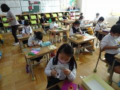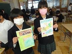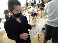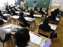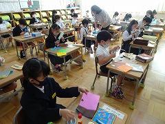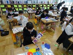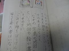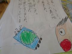 ↓3年生 物語を作っています。物語の組み立てを考えて書く学習で、「宝島冒険」がテーマです。宝島の地図を見て想像を膨らませ、起承転結で物語を組み立て、書いていきます。10枚以上も書いている人がたくさんいました。かんがえがどんどん膨らんでいるようです。文字もイラストも丁寧にかいています。素晴らしい集中力書き綴る作家さんたちのようでした。
