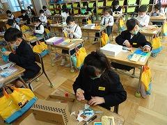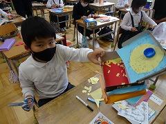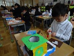 ↑1年 飾りを付けて箱を変身させています。どんな箱に変身するかな?みんな集中して作っていました。