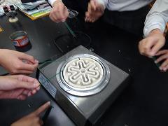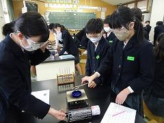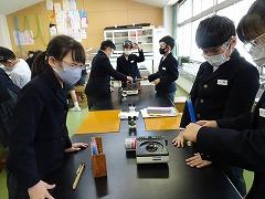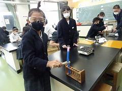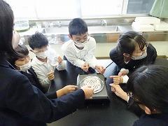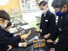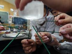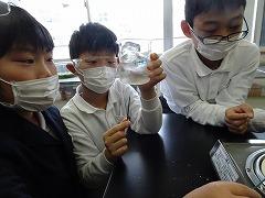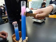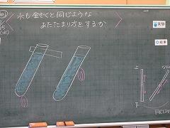 ↑4年理科 水の温まり方を金属と比較しました。水に「し温インク」を入れて温めると、青色からピンク色に変化します。それで、どのように温めるのか見ることができます。試験管の上と下を熱したときの温まり方を観察しました。