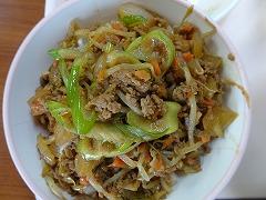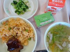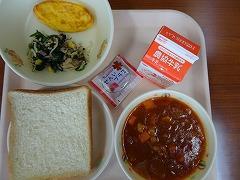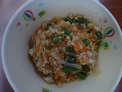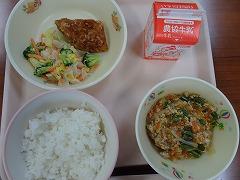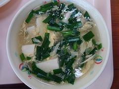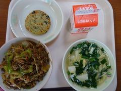 ↑今日の給食は、ボリューム満点の「肉みそどんぶり」でした。肉みそどんぶりには、豚肉、牛肉に、にんにく、たまねぎ、にんじん、しょうが、もやし、それから、ねぎがたっぷりと入っていて、赤味噌で味付けられていてとってもおいしかったです。ニラ玉スープには、これまた、たっぷりのニラと絹ごし豆腐、きくらげ、たまねぎ、ねぎをたまごで閉じてあり、かおり高く温まるスープでした。チヂミには米粉やおから、にんにく、にらも入って食欲がわいてきました。今日もとってもおいしい給食でした。ごちそうさまでした。