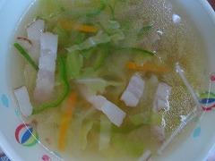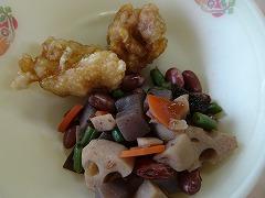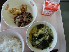 ↓今日の給食は、徳島県献立です。鶏肉のすだち風味、おでんぶ、さつまいもとわかめのスープでした。おでんぶとは、金時豆と根菜類を使った五目煮豆の郷土料理だそうです。たくさんの食材をいただくことができる料理です。鶏肉はすだちのさわやかな風味が効いてさっぱりとおいしくいただきました。わかめとサツマイモの取り合わせも季節感がありとてもよかったです。ねぎや白菜、えのきたけも入っていておいしい味噌汁でした。ごちそうさまでした。