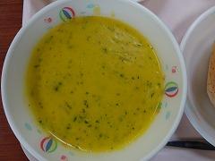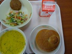↓今日は金曜日ですのでパン給食です。メンチカツとコールスローサラダは胚芽バンズの中に挟んでいただきました。そして、かぼちゃのポタージュスープです。今年の冬至は12月22日のようです。ビタミンAをたっぷり含んだかぼちゃをいただき、風邪をひかずに元気に冬を過ごしたいですね。