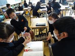 ↑5年道徳 「ペルーは泣いている」の教材文を用いて、世界の人々と交流するために、どんな思いを持つことが大切か考えました。文化の違いをどのように乗り越えていったか、話し合っています。グローバル社会を生きていく子供たちにはぜひとも考えてもらいたい内容です。
