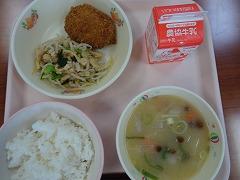 ↓今日の給食和食で、肉じゃがコロッケ、ごま酢和え、大根となめこの味噌汁でした。