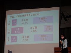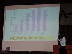 次に町生活状況調査の結果から考えてほしいことをお話しました。平日のゲームの時間、勉強の時間、読書の時間を見比べると、ゲームの時間が多いと、勉強や読書の時間が少なくなっていることがわかります。読書を1日30分~1時間すると、学力は大きくアップしますよ。