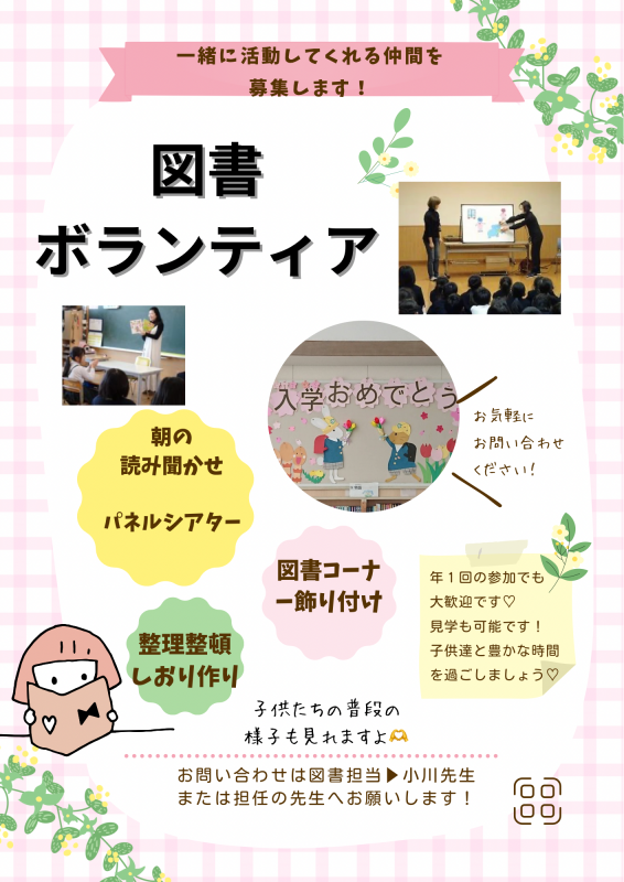 条南小学校では、一緒に活動してくださる図書ボランティアを募集しています。