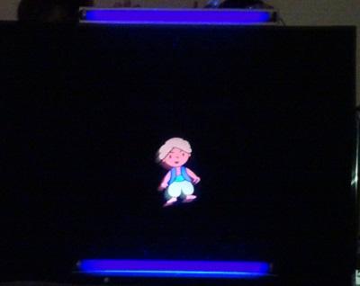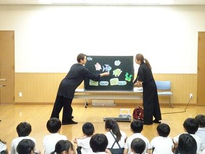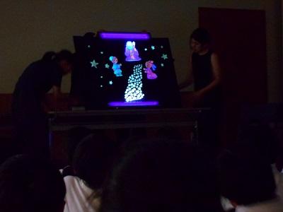 白い画面で行われるシアターから,黒い画面にブラックライトを使って行うシアターに変わると一層子供たちの目が輝きました。
