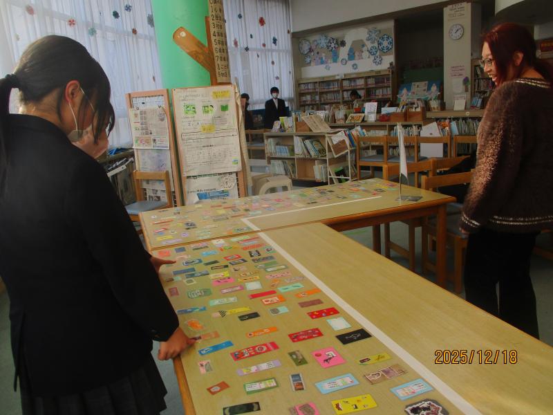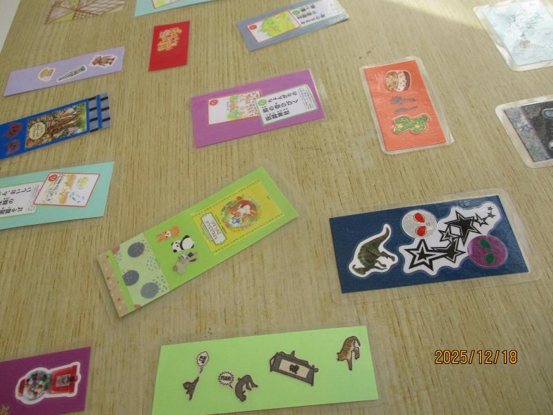 子供たちはその中から楽しんで自分の好きなしおりを選んでいました。本のキャラクターやかるたの柄のしおりなど,たくさんの種類や色のしおりが並び,子供たちはとても喜んでいました。