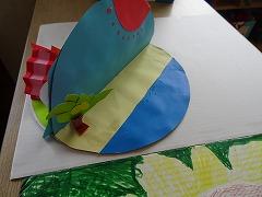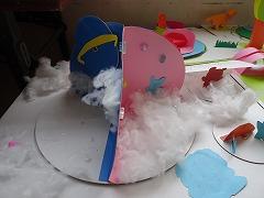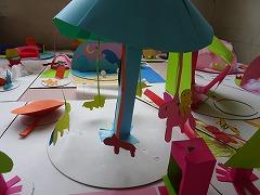 ↓3年生の図工の作品です。回る回る何が回るかな 創造力をいっぱいに働かせて作品を創っています。
