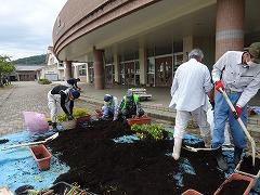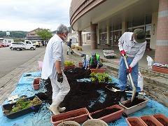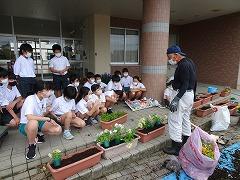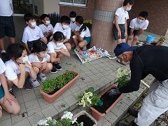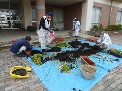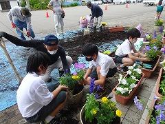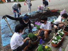 ↑パンジーやビオラを抜き取って、プランターの土を入れ替える作業をしてくださいました。ありがたいです。そして、花の植え方を環境委員会さんに教えてくださいました。