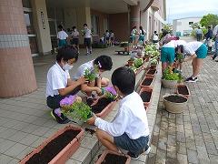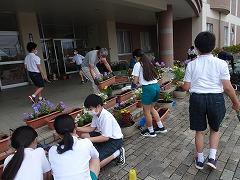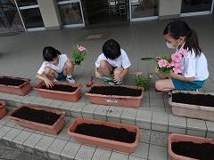 ↑おかげさまで、委員会の時間で330鉢を植え付けることができました。太田のおじいちゃん方、ありがとうございました。水やりや花がら摘みをして、きれいに咲くようにお世話をしていきます。