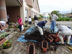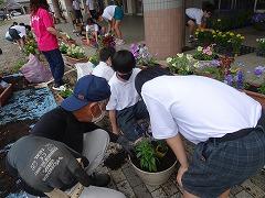 ↓さあ、子供たちも作業開始です。自分のセンスでプランターに花を植え付けていきました。