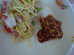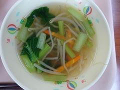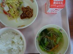 ↓今日の給食です。豚肉のきのこソースかけ、コンソメスープ、ベーコンとキャベツのペペロンチーノでした。コンソメスープには、もやし、小松菜、にんじん、干しいたけ、玉ねぎ等、野菜がたっぷりと入っていました。