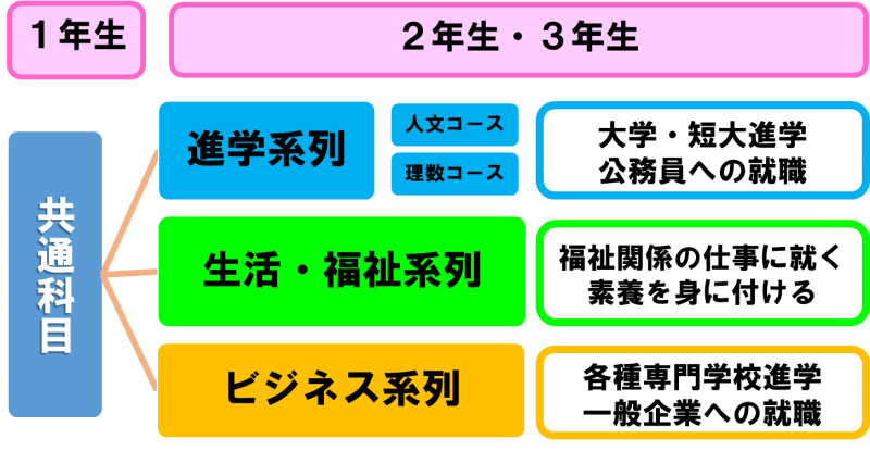 本校では、自分の進路希望や興味・関心に応じて2・3年生から3つの系列・コースに分かれ、科目を選択しそれぞれ特徴的な授業を行っています。