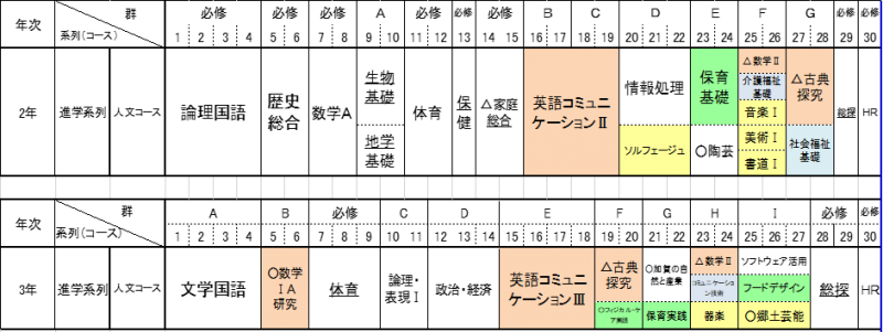 ※ 保育系の大学・専門学校等への進学を考えている場合は緑色・黄色の科目を選択