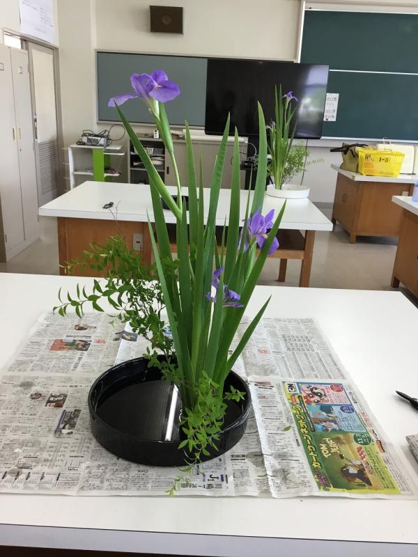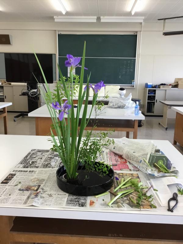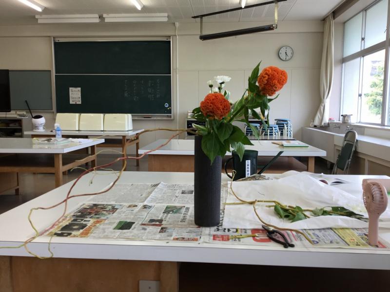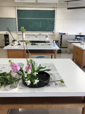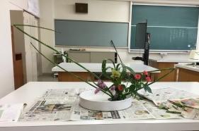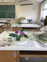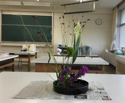 月2回の水曜日、被服実習室で活動しています。3年生1人、2年生1人、1年生3人と人数は少ないですが、外部講師の先生に草月流の生け方を習っています。当面の目標は、文化祭で「自由生け」の作品を展示することです。総文後の今は、一人一人が草月流のテキストやノートを活用し、基礎からみっちりと学んでいます。