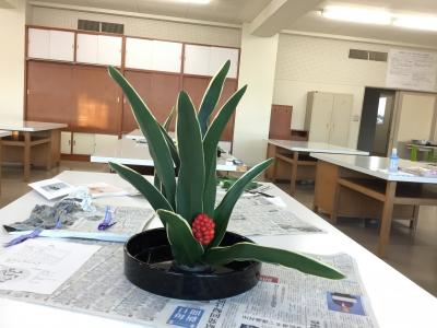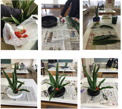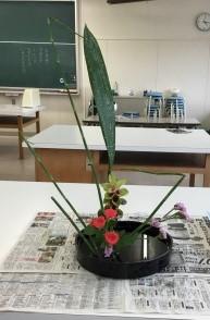その万年青の葉を10枚使って生けました。葉っぱが真直ぐで長いもの、広いものなどそれぞれの葉の特徴に合わせて順番をつけ、生けていきました。とても難しかったですが、同じものを生けていても、仕上がりは部員の個性が出て、微妙に雰囲気が違うものになりました。
