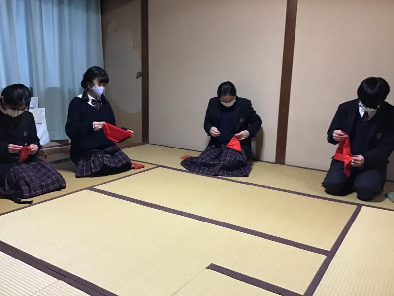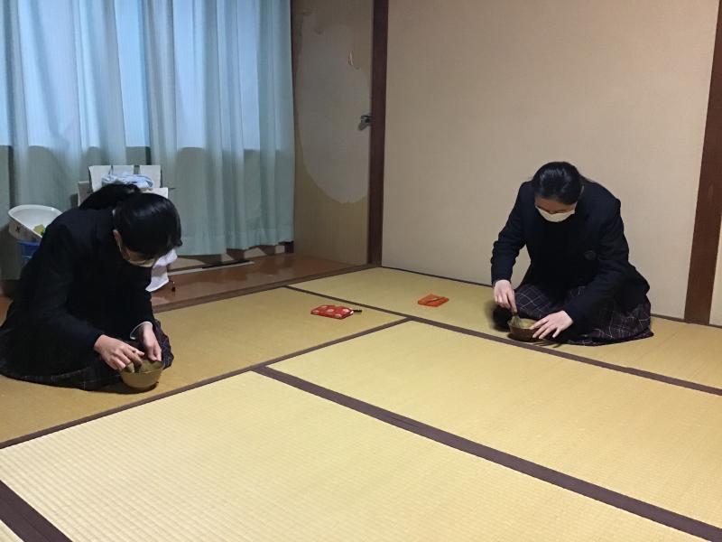 茶道部です。2学期の前半は、飲食を伴う活動ができなかったため、部活動の実施そのものが難しかったのですが、2学期の後半から、活動を再開しました。3年生は引退し、新しく1年生が2名入部しました。現在1,2年生11名で活動しています。部員同士の距離をとり、自分のお茶は自分でたてなければいけないのですが、活動内容を工夫しながらお作法を学んでいます。