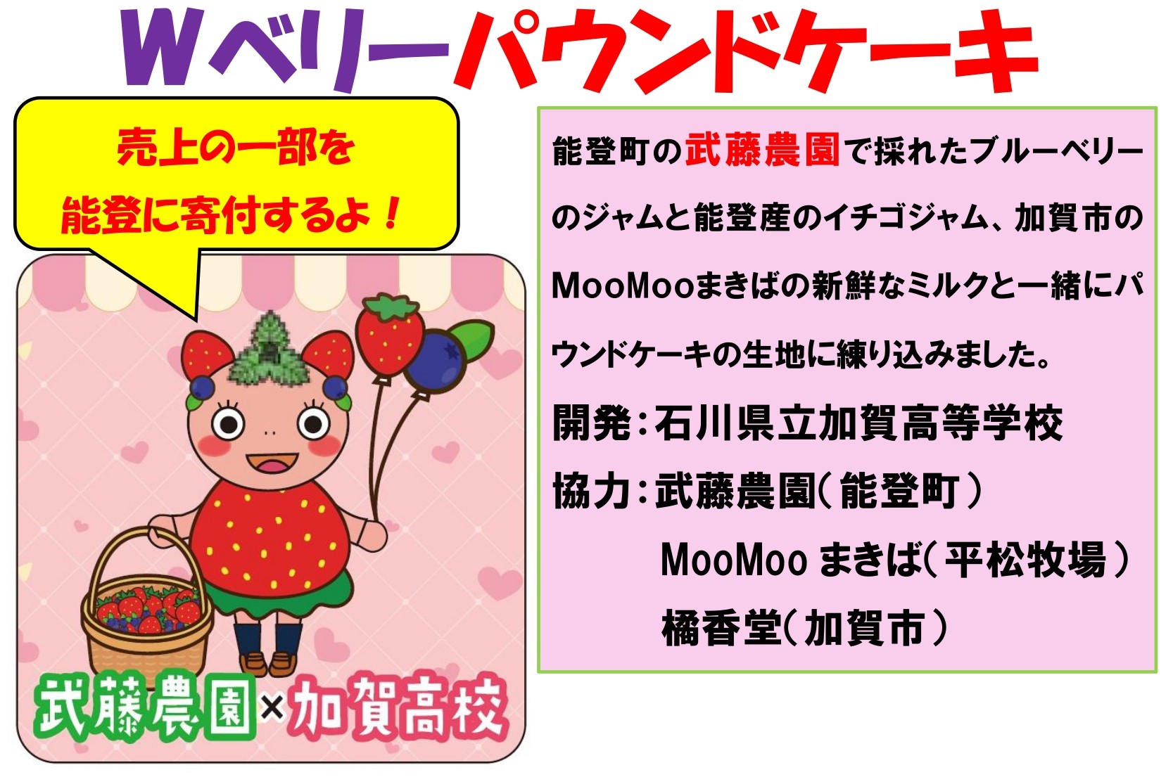 この度、「加賀探究Ⅱ・商品開発班」は、武藤農園さん・平松牧場MooMooまきばさん・橘香堂さん協力のもと、新商品【Wベリーパウンドケーキ】を開発しました。明日開催の文化祭や各種イベントで販売予定です。10/26(土)はイオンモール白山で行われる「いしかわ産業教育フェア」でも販売します。