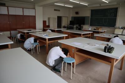 この訓練は「しゃがむ、かくれる、じっとする」といった「安全行動」を約1分間行うものです。