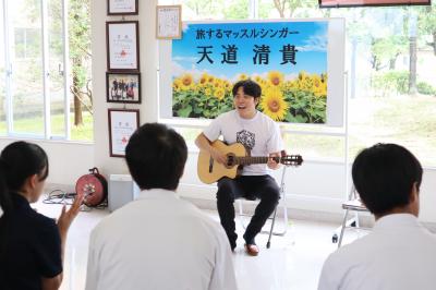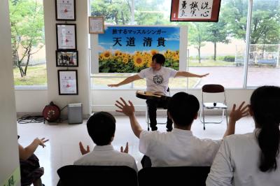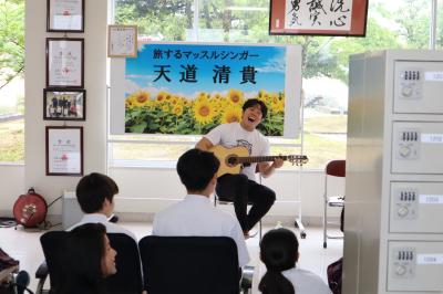 7月1日、旅するマッスルシンガー天道清貴さんが5月のコンサートに続いて来校し、生徒玄関でサプライズミニコンサートを開いてくださいました。朝から素敵な歌声を聴いて、みんな元気いっぱいになりました。清貴さんありがとうございました。