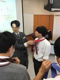 写真は、ネクタイの結び方を練習している様子です。