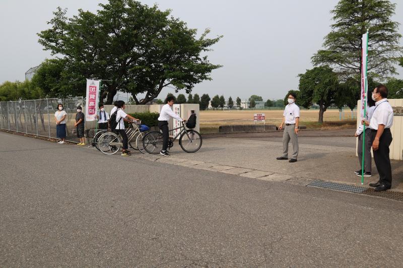 自転車で通学する生徒は、一時停止や左側通行を守って、安全に登校していました。