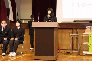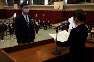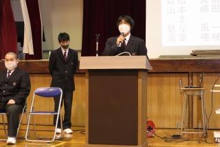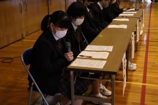 生徒会役員選挙では、投票前に立候補者が全校生徒に向けて立候補の動機や抱負を述べました。