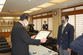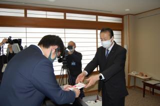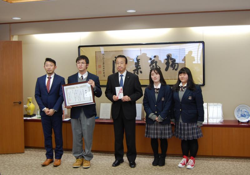 2022年3月7日 15時28分今年度、3年生の「総合的な探究の時間」で開発したオリジナル商品「加賀梨バウム(加賀梨をジャムにして、バウムクーヘンの生地に練りこみました)」の売上金の中から¥50,000を加賀市へ、福祉活動に役立ててもらいたく寄附しました。3年生の開発グループが加賀市役所で宮元陸市長へ寄附金を手渡し、お礼に感謝状をいただきました。本校では、地域に貢献できるような活動を今後も続けていきたいと思います。