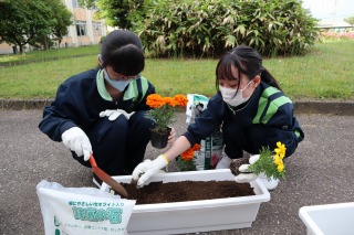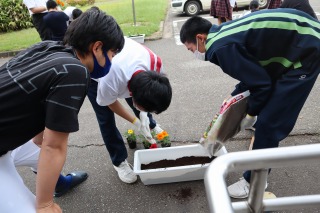 放課後に、プランター花植えを行いました。