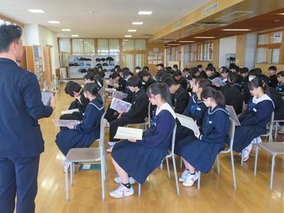 22日(木)は総合的な学習の時間に、職業人に学ぶ会の前段として、1年生3名の担任から「自分の人生について語る会」を行いました。永井有先生、玉井先生、城戸先生がこれまでの人生について生徒たちに話をしました。